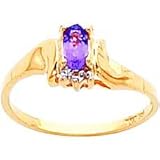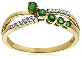 Emeralds and diamonds cross paths in this beautiful split band journey ring, made from polished 10 karat yellow gold. It features a line of five round emeralds, graduated in size and held in shared prong settings. The emeralds trace a diagonal across the top of the finger, weaving across a line of 13 shimmering diamonds accents (.05 cttw). This graceful, feminine ring is very flattering on the finger and makes a lovely gift for a special occasion.