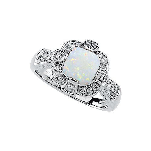 The cool gleam of 14k white gold with the fire of diamond and cushion cut opal cabochon combine to a beautiful effect in this uniquely elegant ring. Exquisitely rendered in white gold and prong set with dazzling opal. A gorgeous evening look.