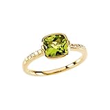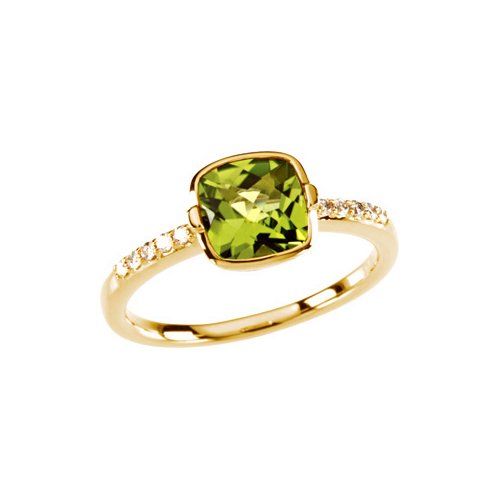 Feel truly regal in this peridot ring. This peridot ring with diamond set in rich yellow gold will look spectacular no matter what else you're wearing.