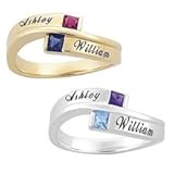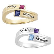 Contemporary styled couple's ring features 2 square shaped Austrian crystal birthstones. We add 2 names, up to 10 characters each. Available in full sizes, 5-12. Please allow 3-4 weeks for delivery. Item cannot be gift boxed.