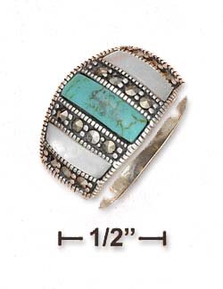 Sterling Silver Turquoise Mop Marcasite Dividers Dome Ring - Size 10.0